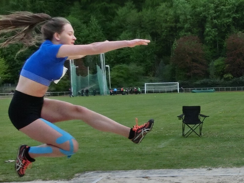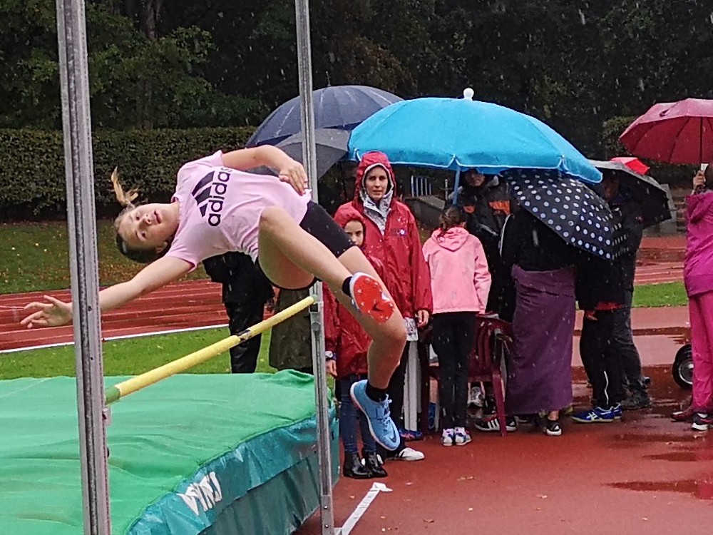Der Sonntag total verregnet, dazu etliche Verkehrsumleitungen, Ersatzverkehr und ein ausgefallener Bus, Luisa zu spät für den Hochsprung in der w15, das Wettkampfbüro hatte ein Einsehen und so durfte sie außer Wertung mit Milly in der w12 starten. In strömenden Regen übersprang sie 1,54m und scheiterte knapp an der 1,58m, Milly kam mit übersprungenen 1,37m als Fünftplatzierte aufs Podest.